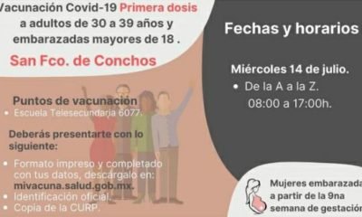 Mañana inicia la vacunación de la primera dosis a personas de 30 a 39 años en el municipio de San Francisco de Conchos. La aplicación será...