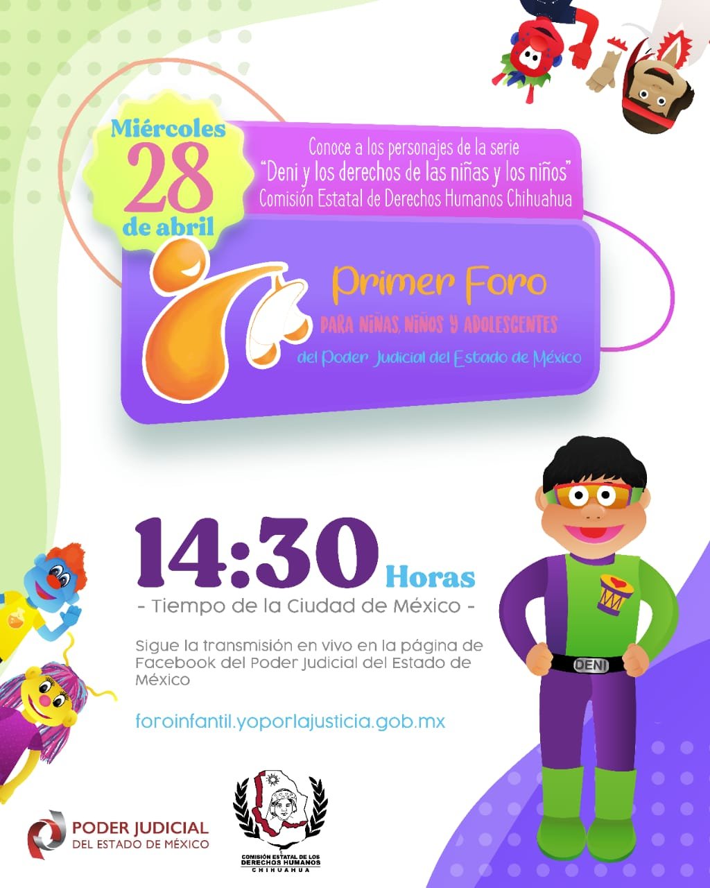 Atendiendo la invitación que el Poder Judicial del estado de México realizó desde el pasado mes de febrero, la CEDH presentará desde las instalaciones del Museo de Deni, un programa en vivo mediante plataformas virtuales, con la participación de los personajes de la serie “Deni y los derechos de las niñas y los niños”, así como de personal de Capacitación de la oficina de Delicias.