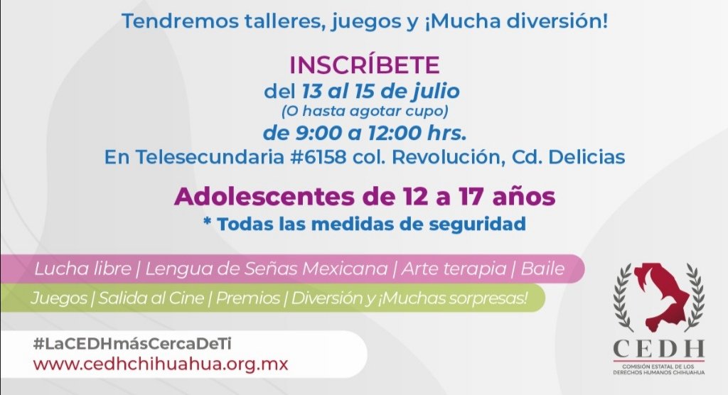 En este evento, los adolescentes podrán participar en diferentes actividades de aprendizaje sobre derechos humanos, así como algunas recreativas. Entre ellas destacan lengua de señas, arte terapia, baile y lucha libre, además de que se dialogará con ellos sobre el manejo de emociones, identificación y manejo de ansiedad, prevención del suicidio, entre otros temas cruciales.