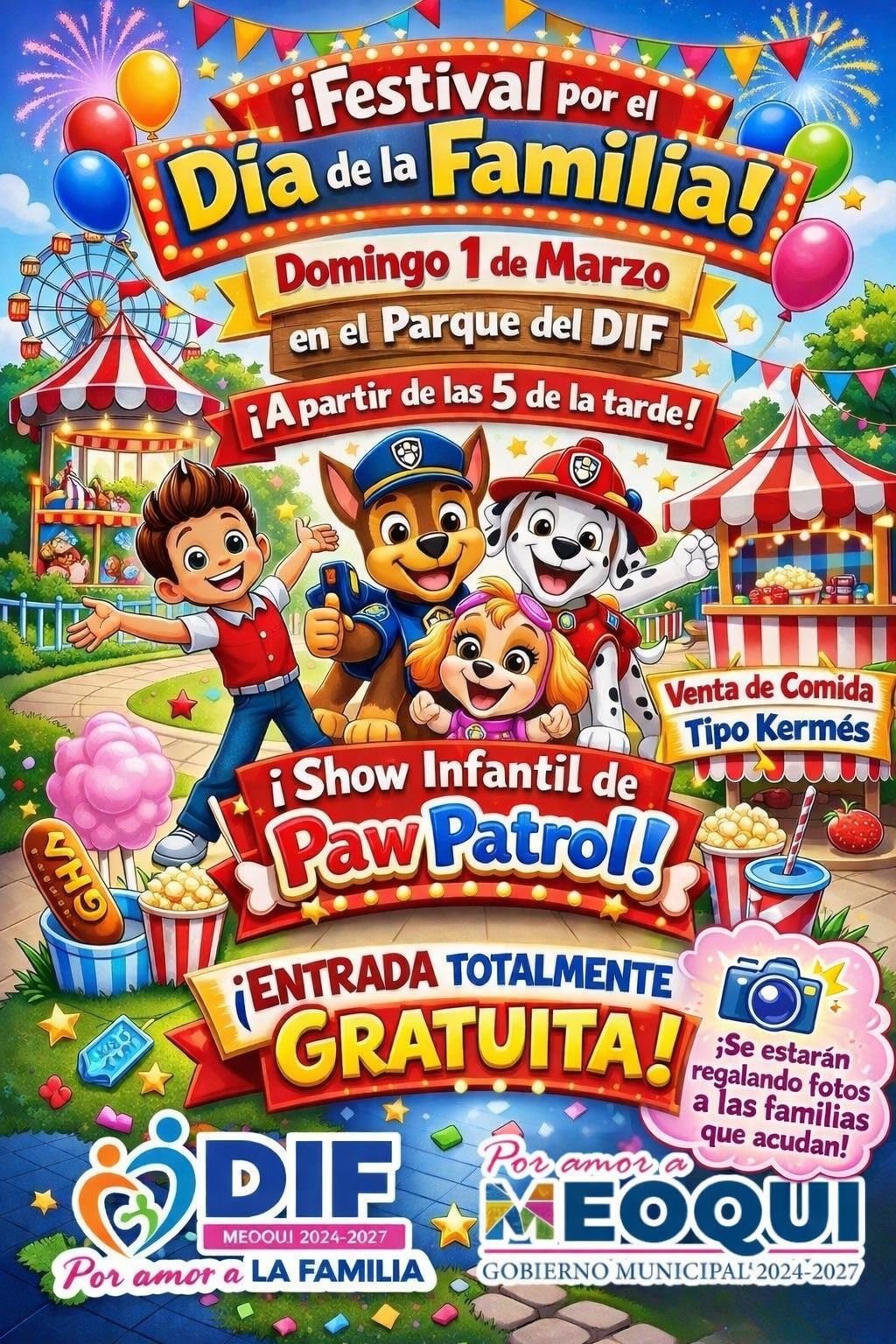 Con un ambiente de convivencia y lleno de diversión, el Gobierno Municipal de Meoqui, a través del DIF Municipal, invita a las familias de la región a celebrar el Día de la Familia, este domingo 1 de marzo en el parque del DIF, con entrada totalmente gratuita, a partir de las 5:00 de la tarde.