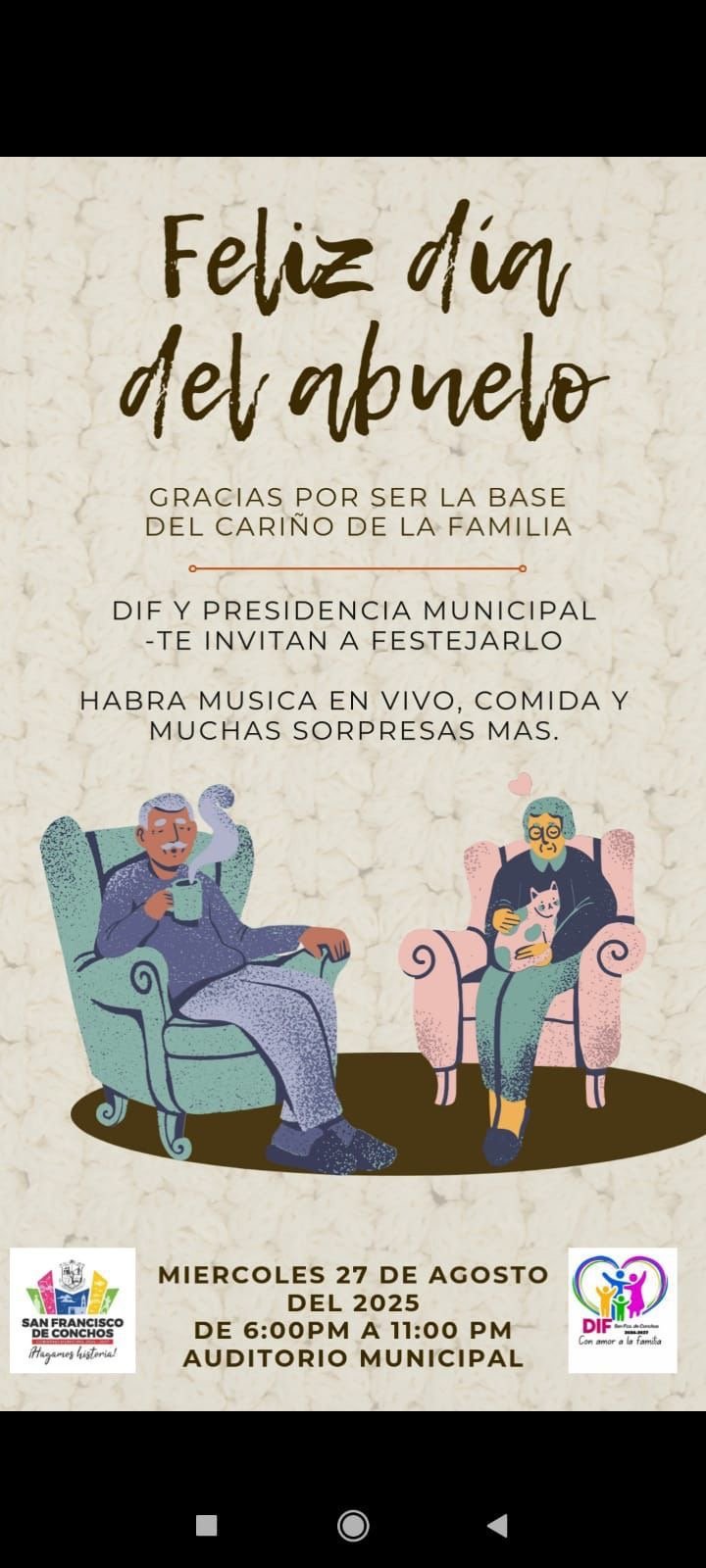 El Gobierno Municipal de San Francisco de Conchos, encabezado por la alcaldesa Norma Pavía Manríquez, en coordinación con el DIF Municipal, presidido por Elena Amparán y con la dirección de Eristeo Licano, invitan a toda la comunidad a celebrar el Día del Abuelo con un evento especial lleno de música, convivencia y sorpresas.