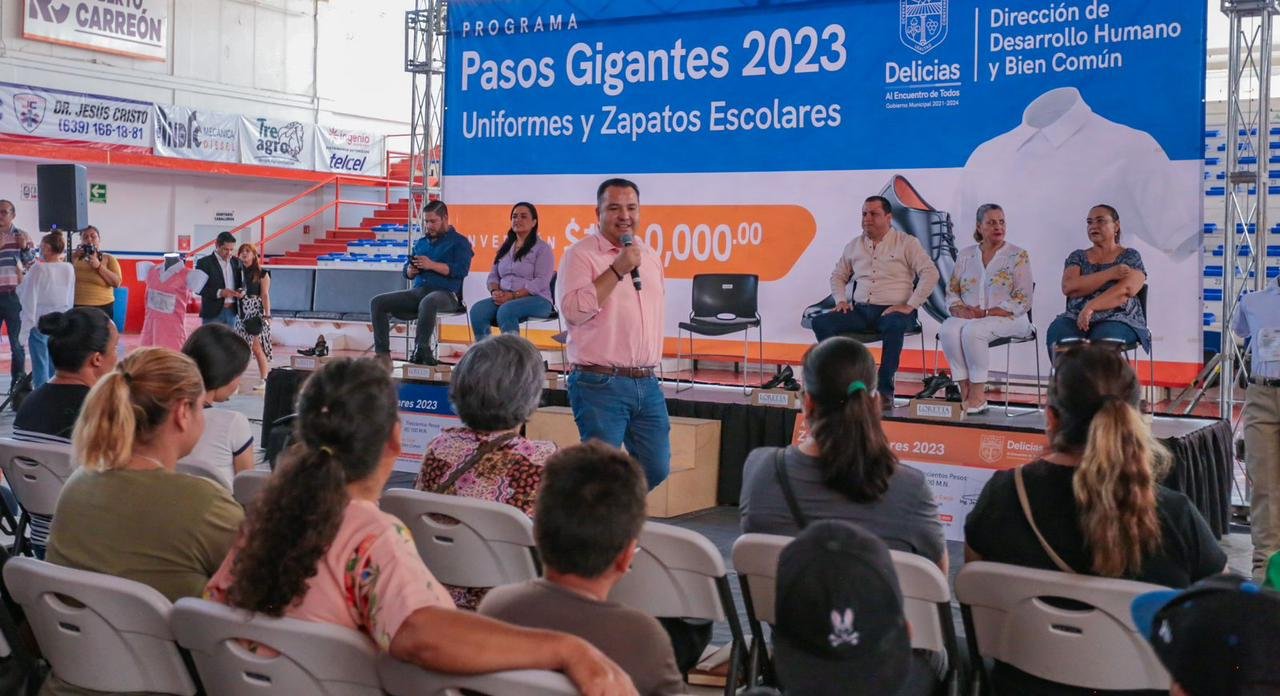 Este martes se convocó a los beneficiados del programa “Pasos Gigantes” de la dirección de Desarrollo Humano y Bien Común (DHyBC) Delicias, el cual consistió en otorgar cerca de 14 mil apoyos de zapatos y uniformes escolares a niños, niñas y jóvenes del municipio.