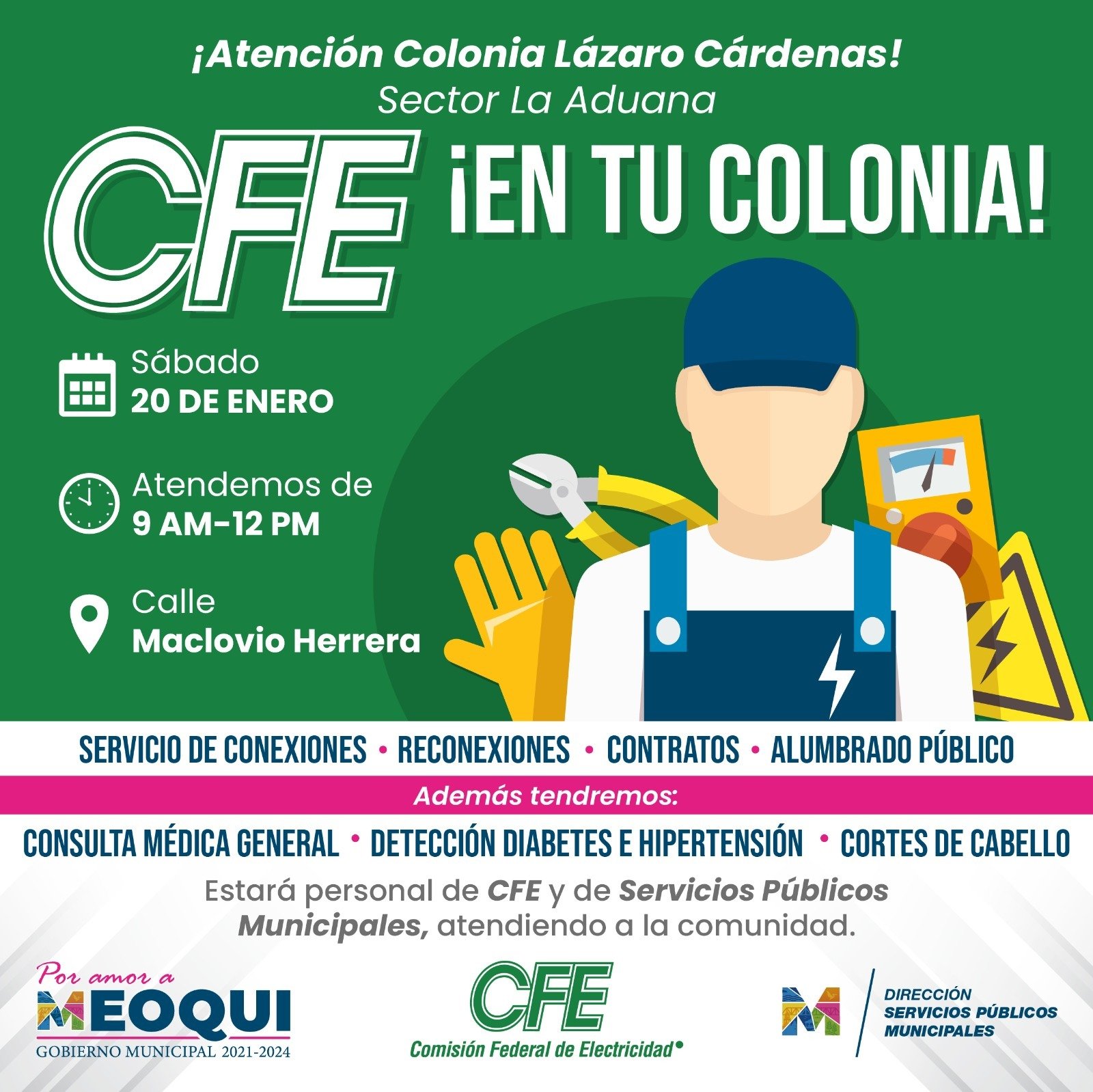 El programa “CFE en tu Colonia” llegará a la zona conocida como La Aduana en el seccional de Lázaro Cárdenas este sábado 20 de enero, en un horario de 9 de la mañana a 12 de la tarde, donde la ciudadanía podrá atender temas como conexiones, reconexiones, contratos y alumbrado público, contando además con la presencia de la alcaldesa Miriam Soto y todo su gabinete, para escuchar las peticiones de la ciudadanía entre otros servicios implementados por el Gobierno Municipal.
