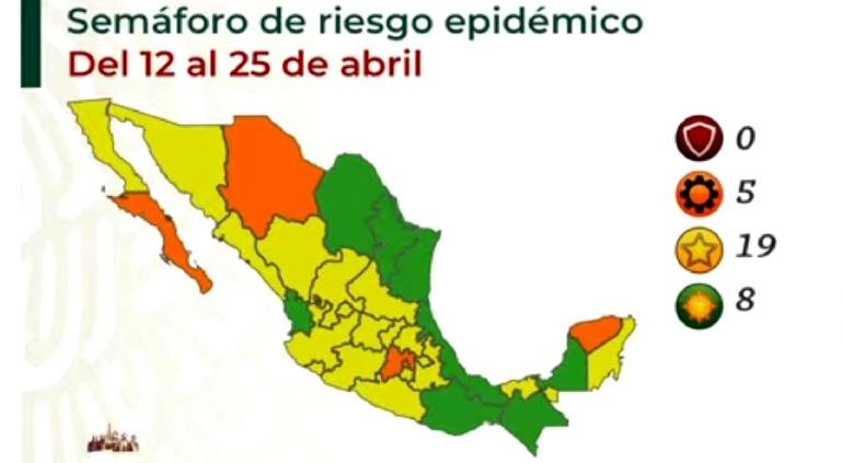 Dicho semáforo, según la Secretaría de Salud del Gobierno de México, tendría vigencia del siguiente lunes, 12 de abril, hasta el domingo, 24 de abril.