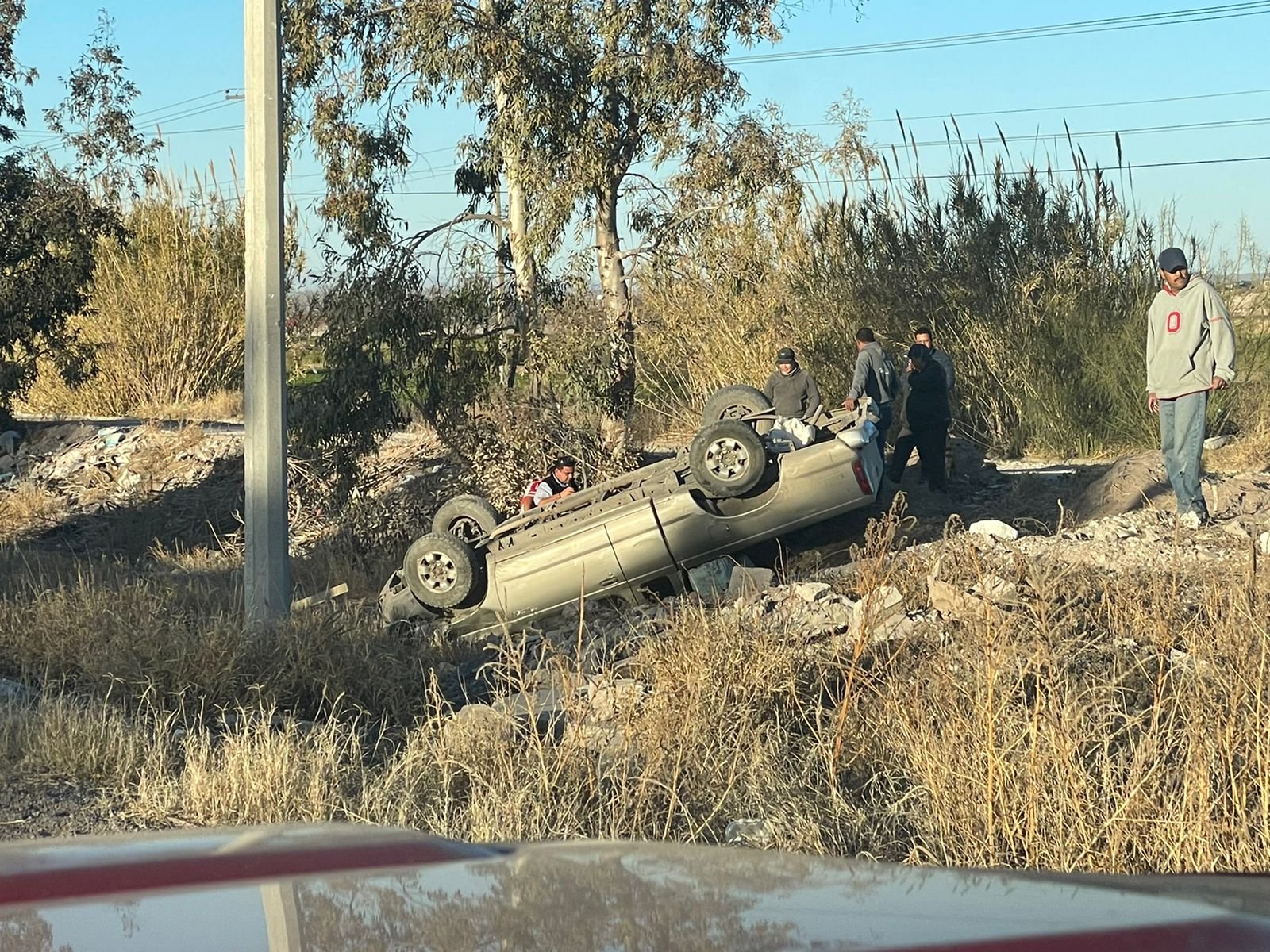 Esta tarde se registró una volcadura en la carretera que conduce de Delicias a Meoqui, a un costado de las jaulas de bateo, el cual afortunadamente solo dejó daños materiales.
