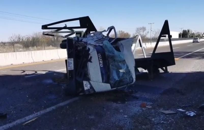 El camión de color blanco con redilas verdes quedó totalmente destrozado sobre uno de los carriles de circulación y derramó combustible, por lo que elementos de bomberos de Meoqui acudieron a realizar maniobras para evitar otro percance.