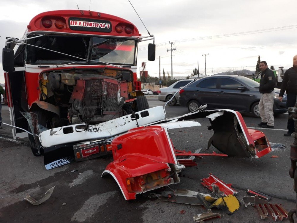 El percance ocurrió sobre la avenida Juan Pablo II y calle 85 a la altura de la colonia Aeropuerto, cuando el camión de la maquiladora TRW invadió el carril y provocó un encontronazo, que destrozó la parte delantera del autobús de Sofi