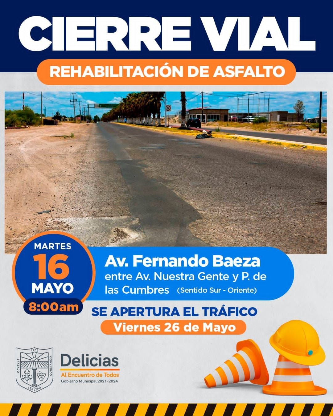 Explicó que por la complejidad de los trabajos, la desviación para quienes circulan en el sentido de ingreso a Delicias será por la avenida Nuestra Gente, tomando la calle Séptima Sur para poder reincorporarse nuevamente a la Fernando Baeza, ya sea por un costado del Complejo de Seguridad, por la avenida 16 Sur o bien, hasta el boulevard Gómez Morín, para ingresar al Centro de la ciudad.