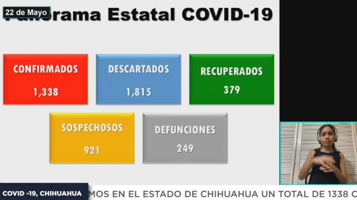 CHIHUAHUA.- El director de Salud Zona Norte, Arturo Valenzuela Zorrilla informó que Chihuahua presenta al corte del 22 de mayo un total de mil 338 casos de coronavirus (COVID-19) confirmados en 32 municipios, 249 decesos, 379 recuperados, 921 sospechosos y mil 815 descartados.