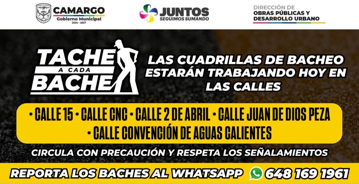 Cinco vialidades de Camargo recibirán mantenimiento este viernes con “Tache a Cada Bache”