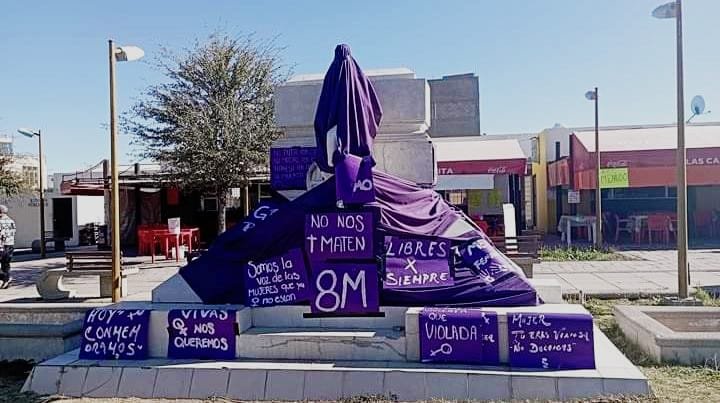 Fueron colocados carteles y mantas moradas en el monumento de “La Madre”, en el parque lineal.