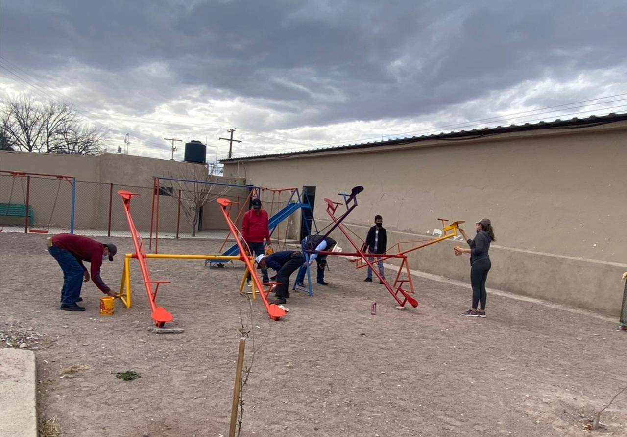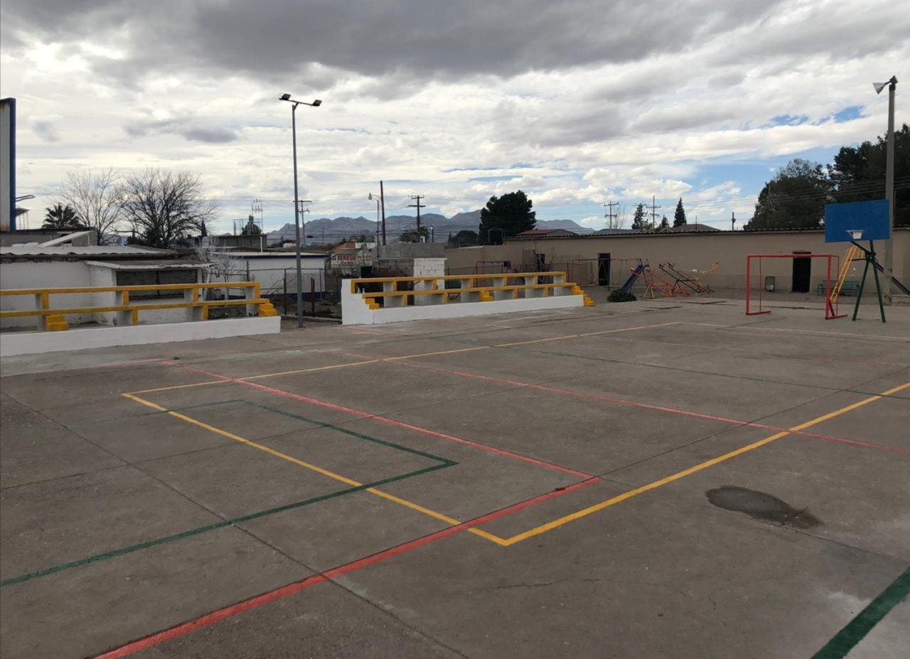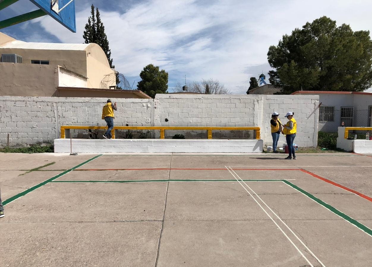 La pintura fue donada por el Club de Leones de Delicias A.C., por lo que estuvo el presidente Ricardo Bermudez y tambien Xóchitl Pérez, directora del comité de Damas del Club, ayudando en lo que fue la pintada de la cancha.