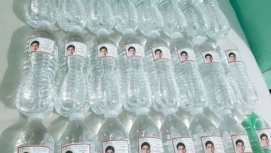 Sobre el bulevar Manuel Ávila Camacho repartieron más de 2 mil 500 botellas de agua de medio litro. En las etiquetas van los datos del desaparecido.