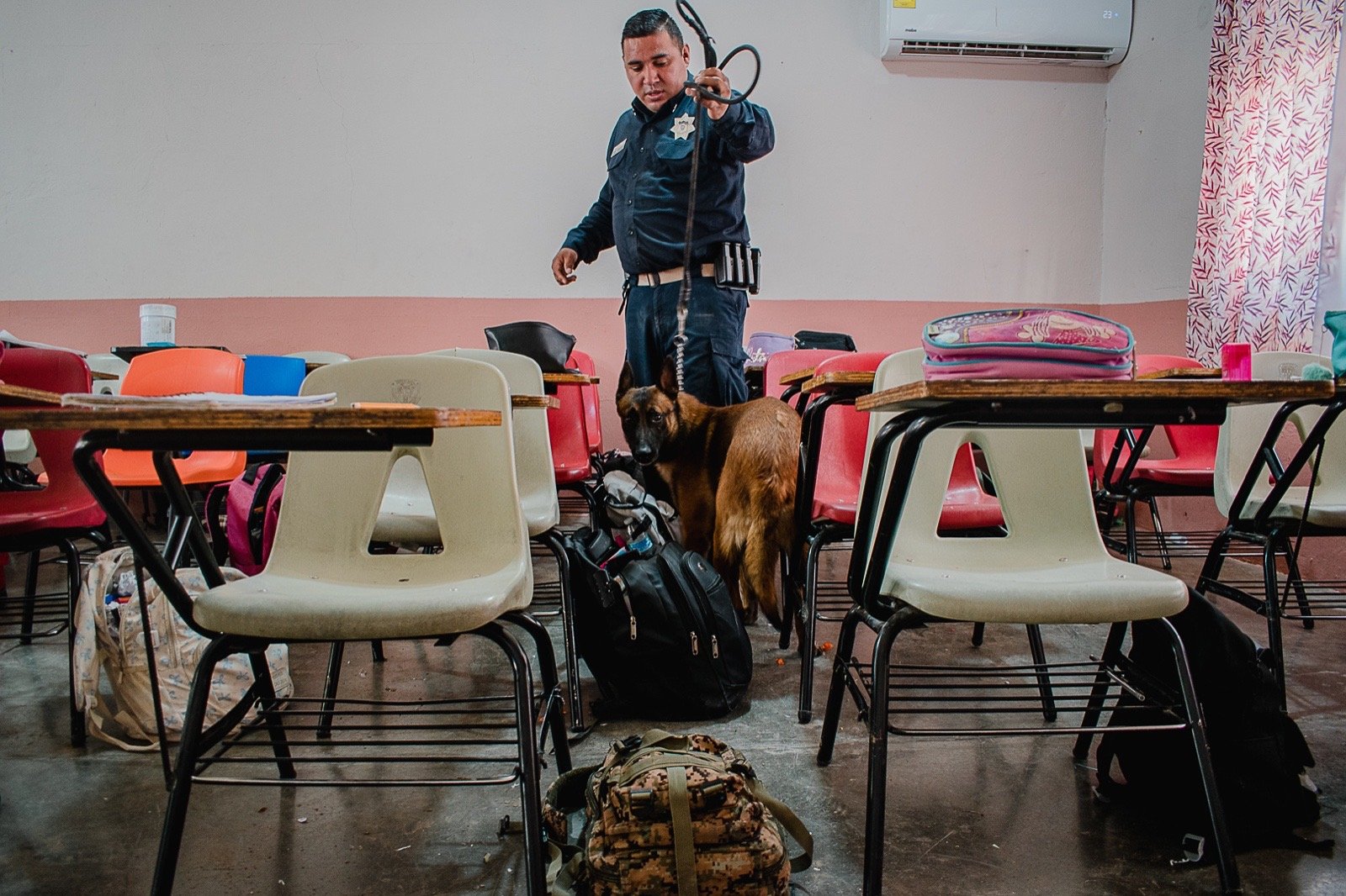 Durante la actividad se contó con la participación del agente canino “Mochi”, perteneciente al grupo K9, quien apoyó en la revisión preventiva con el objetivo de mantener entornos escolares seguros.