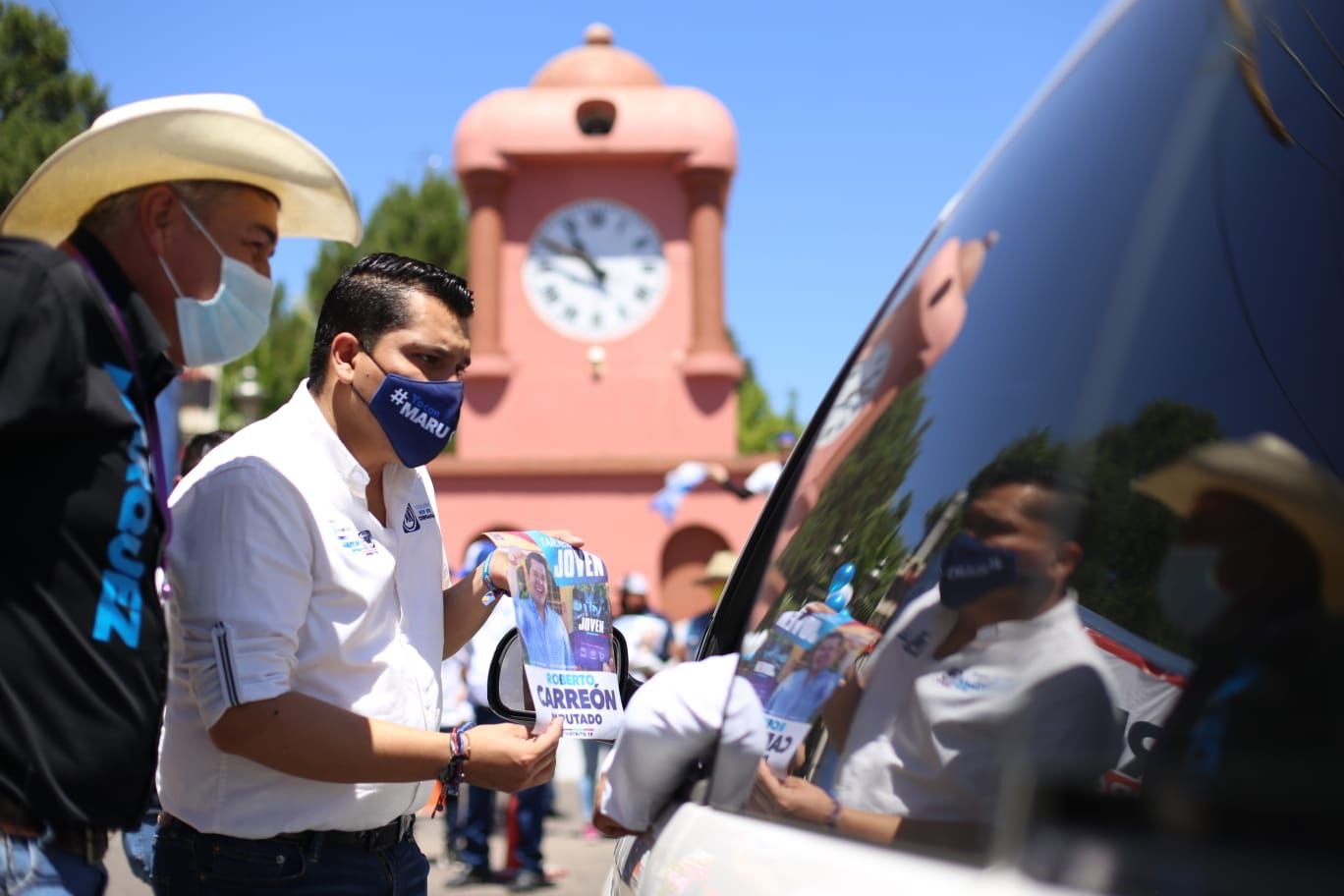 El representante de la coalición Nos Une Chihuahua, Roberto Carreón, acompañó al candidato a la alcaldía por el municipio de Rosales, Marcial Márquez, en una pega de engomados con gran aceptación por parte de los habitantes del municipio.