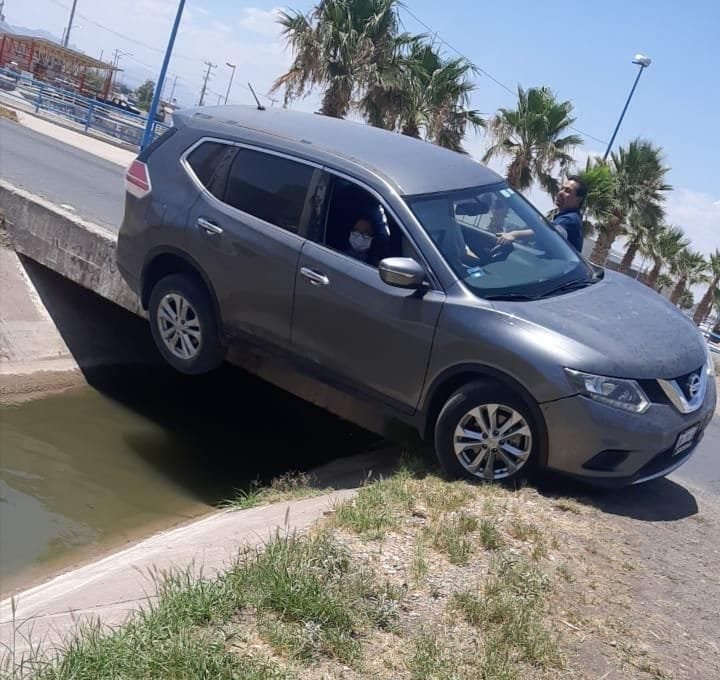 Fue en la avenida Jesica Fernanda Jurado donde se reportó la caída a canal, motivo por el cual los elementos de vialidad se dirigieron a la zona y vieron a una camioneta de la marca Nissan, línea X-trail, color gris, modelo reciente, en la cual su conductor no se percató de la presencia del canal cuando conducía de reversa y terminó a punto de caer.