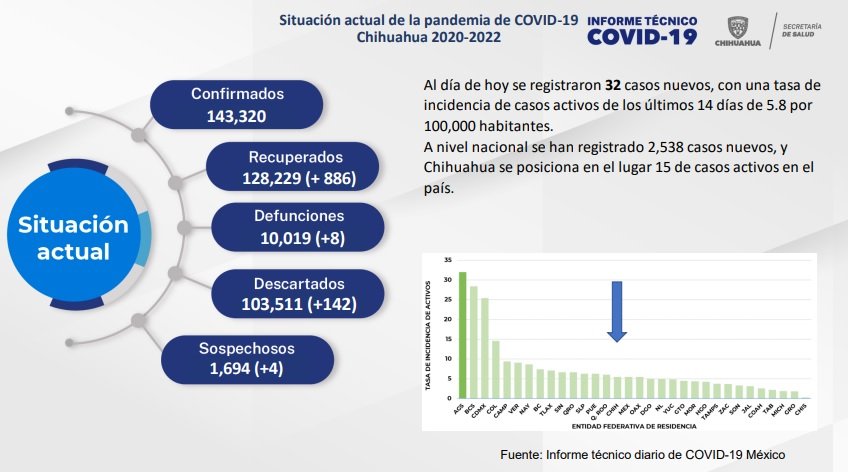 En las últimas 24 horas se confirmó que 32 nuevos contagios, registrados en los municipios de Juárez (+5), Chihuahua (+14), Parral (+3), Cuauhtémoc (+2), Delicias (+2), Guachochi (+2), Buenaventura (+1), Guazapares (+1), Balleza (+1) y Uruachi (+1).