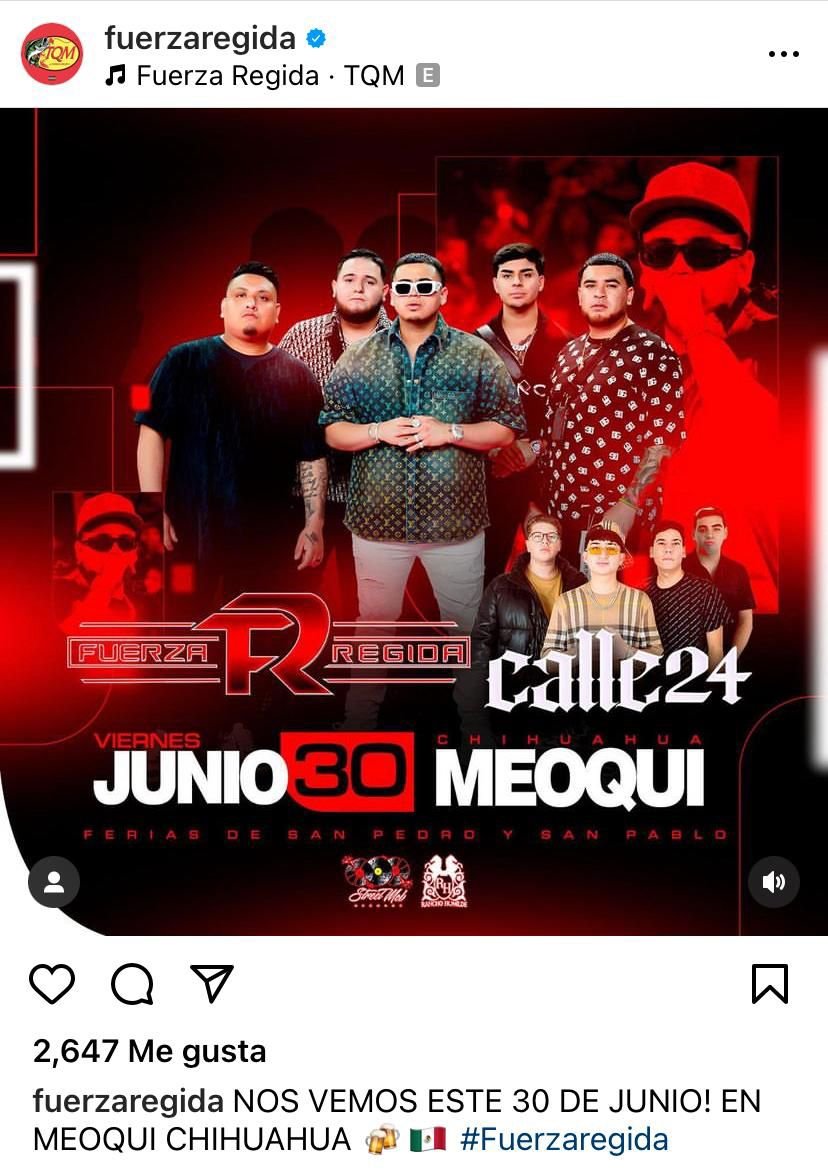 A través de sus redes sociales oficiales el grupo regional mexicano Fuerza Regida, reafirmó su presentación en la Feria San Pedro y San Pablo 2023 de Meoqui para este próximo viernes 30 de junio, donde no llegarán solos, puesto que vendrán acompañados por Calle 24, conjunto oriundo de Cuauhtémoc, Chihuahua.