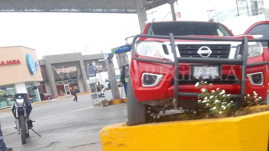 Esta tarde un accidente no muy común se presentó en la gasolinera ubicada a la altura del boulevard Oscar Flores, dónde el conductor de una pick up de color rojo confundió el freno con el acelerador y se subió a un macetero propiedad de la gasolinera.