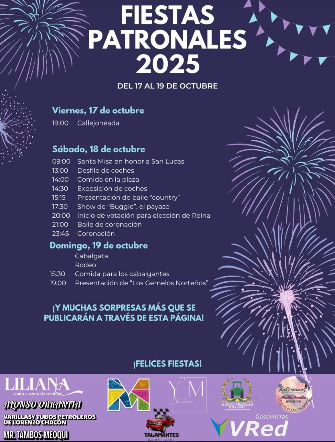 Posteriormente, el día domingo 20 de octubre a las 12 del mediodía, se llevará a cabo la Cabalgata la cual partirá desde Orinda hasta San Lucas y cerrando con un gran rodeo, así como con la presentación de “Los Gemelos Norteños”. Finalmente, extendió una invitación abierta al público en general para asistir y disfrutar de este fin de semana festivo: “El comité es muy trabajador y entusiasta, estamos listos para recibirlos. Se ponen muy padres las fiestas, los esperamos con mucho gusto”, concluyó.