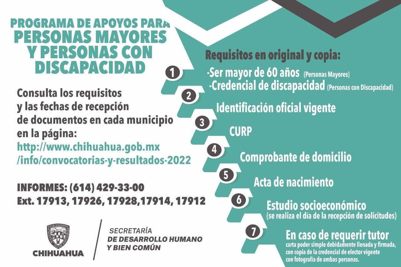 Para mayor información sobre las convocatorias del Programa de Apoyos para Personas Mayores y Personas con Discapacidad 2022, la Secretaría de Desarrollo Humano y Bien Común invita a comunicarse al teléfono (614) 429-33-00 extensiones 17904, 17912, 17912, o acudir a Calle Agustín Melgar 3703, Colonia Nombre de Dios en un horario de 8:00 a 16:00 horas.