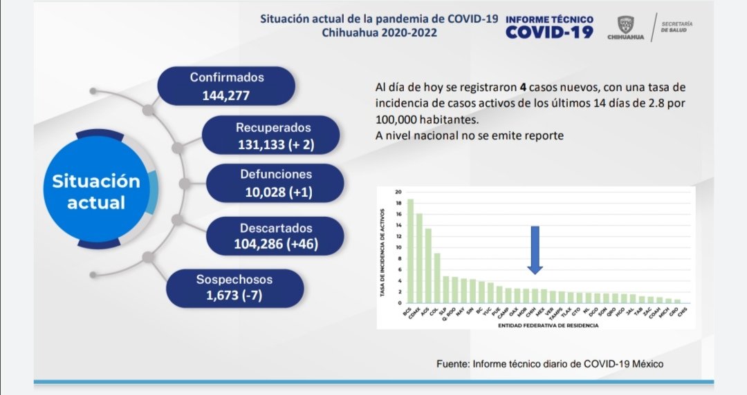 En las últimas 24 horas se reportaron 4 casos nuevos de coronavirus que se registraron en los municipios de Juárez (+1), Chihuahua (+2) y Aldama (+1).