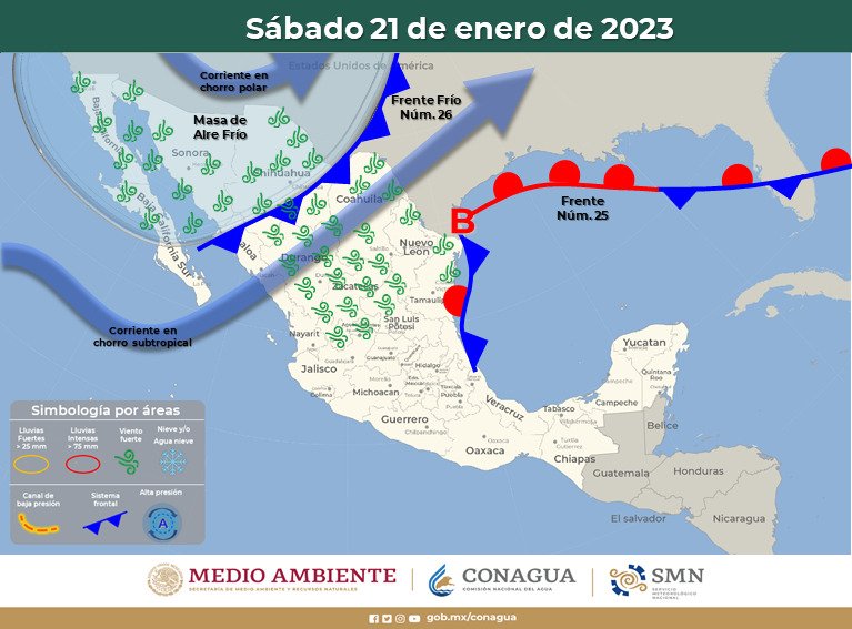 La Coordinación Estatal de Protección Civil (CEPC), indicó que, para este viernes 20 de enero, el ingreso del frente frio número 26 provocará un descenso marcado en las temperaturas en gran parte del estado, además de la posibilidad de presencia de nieve, aguanieve durante el inicio de semana y fuertes rachas de viento.