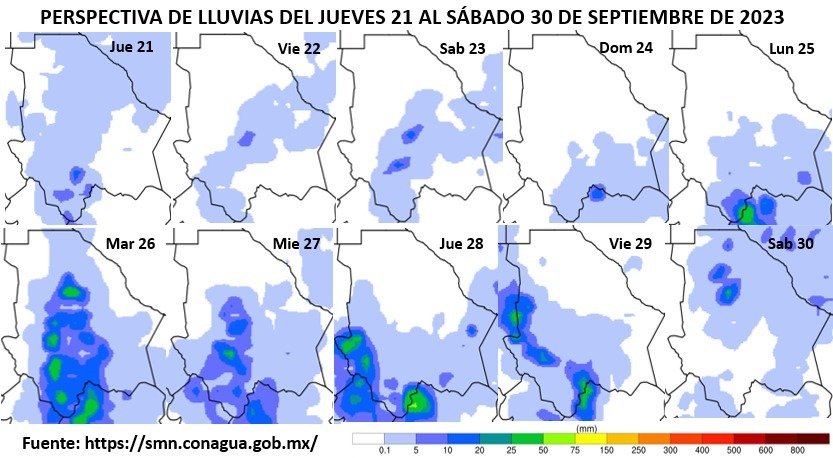 En esas condiciones se esperan lluvias de dispersas a moderadas con chubascos (de 5.1 a 25 mm) en partes de la zona suroeste, que incluye los municipios de Guadalupe y Calvo, Nonoava y Balleza.