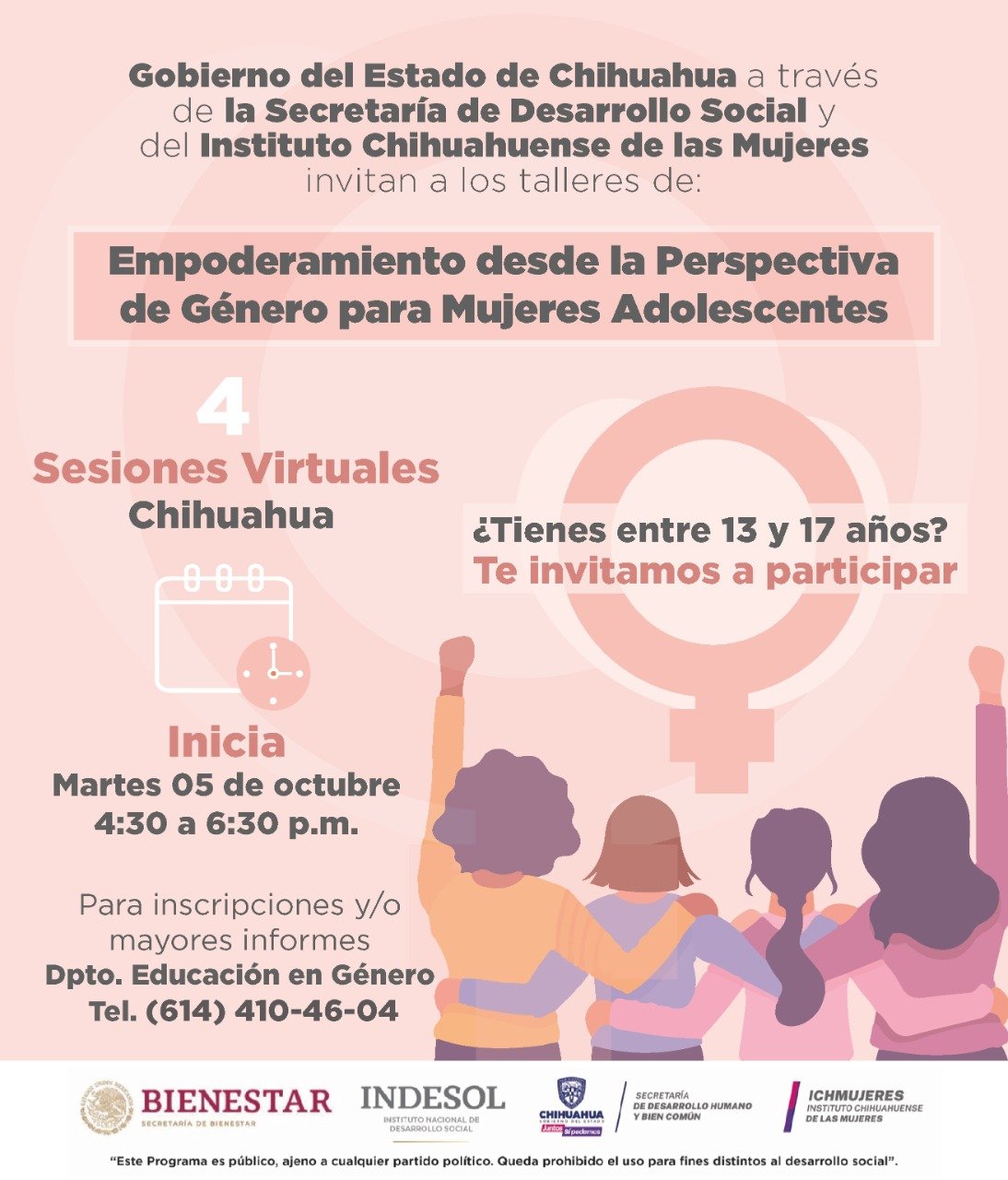 El Gobierno Estado, a través del Instituto Chihuahuense de las Mujeres (ICHMUJERES) invita a participar en el taller “Empoderamiento desde la Perspectiva de Género para Mujeres Adolescentes”, dirigido a jóvenes de entre 13 y 17 años de los municipios de Chihuahua, Nuevo Casas Grandes, Ojinaga y Madera.