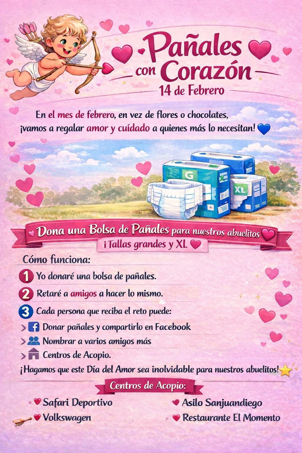Se invita a la ciudadanía a participar en la campaña “Pañales con Corazón”, una iniciativa solidaria que convoca a donar pañales para adultos mayores este 14 de febrero.