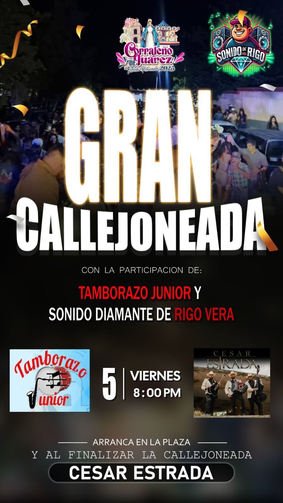 Al finalizar la callejoneada, la noche continuará con la presentación especial de César Estrada, quien se encargará de cerrar con broche de oro, ofreciendo un espectáculo para el gusto del público.