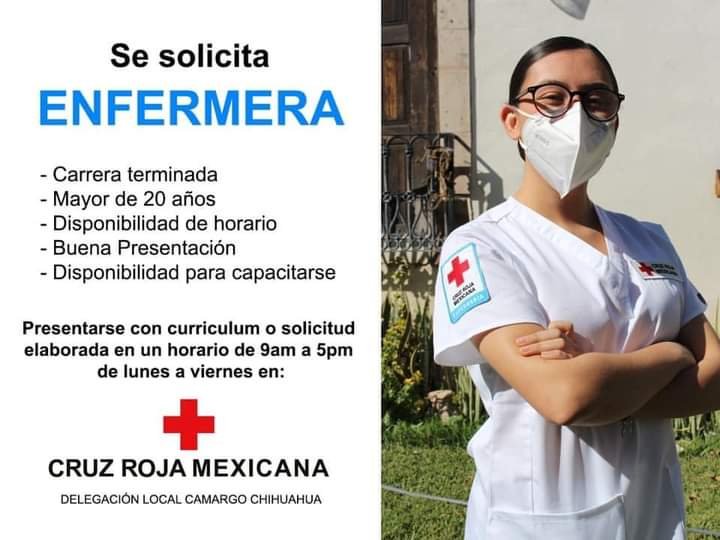 La delegación de la Cruz Roja Mexicana de Camargo dio a conocer que se encuentran solicitando enfermera.