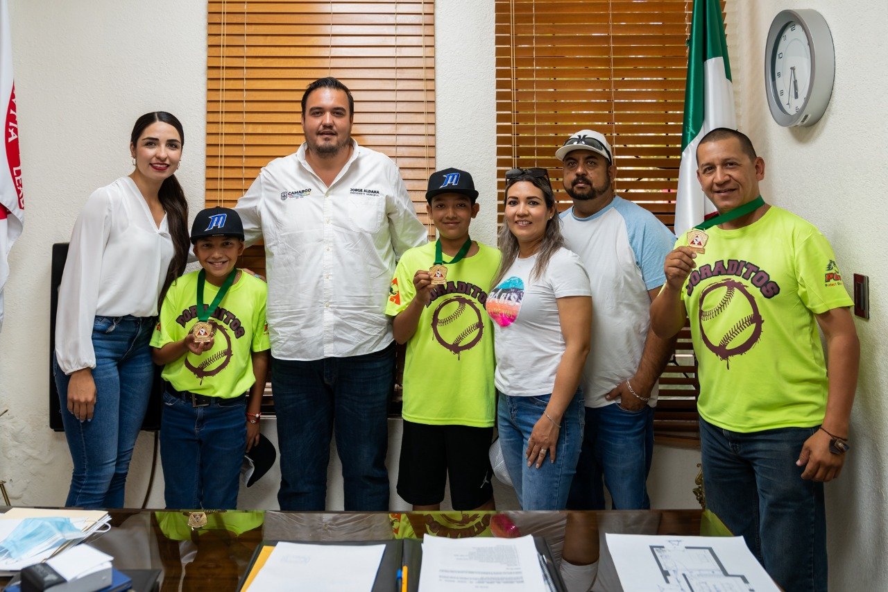 Cuentan con el apoyo del Municipio para ir al mundial: Jorge Aldana recibe a Dereck Carillo, Martin Villa y Martin Villa Jr, campeones nacionales con Doraditos de Chihuahua