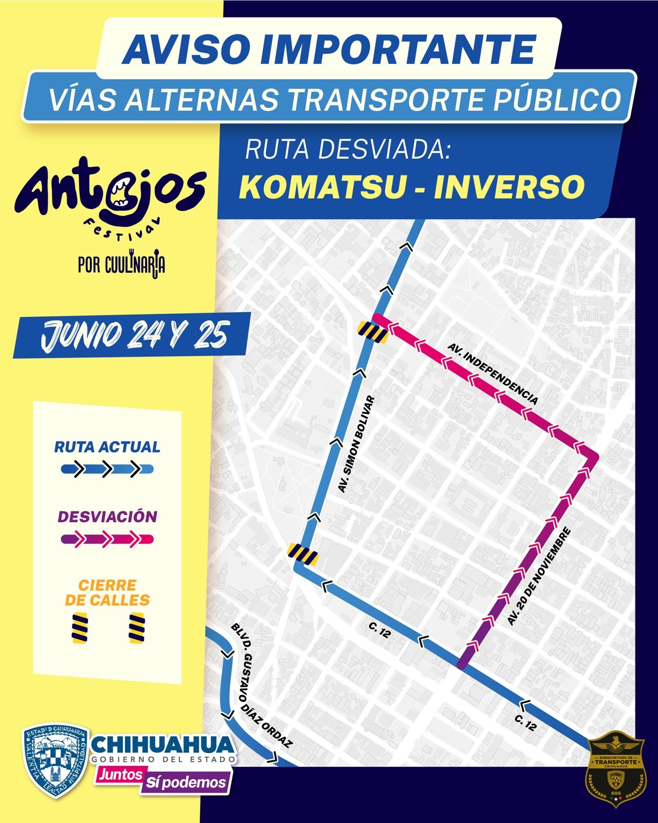 Para las rutas Komatsu-Inverso, Mármol, Villa Juárez-Kennedy-Fuentes Mares y Villa Juárez-Ávalos-Plan de Ayala, el desvío es de norte a sur sobre calle 12, para dar vuelta a la derecha sobre avenida 20 de Noviembre, para dar vuelta a la izquierda y subir por avenida Independencia, para continuar su recorrido de manera habitual.