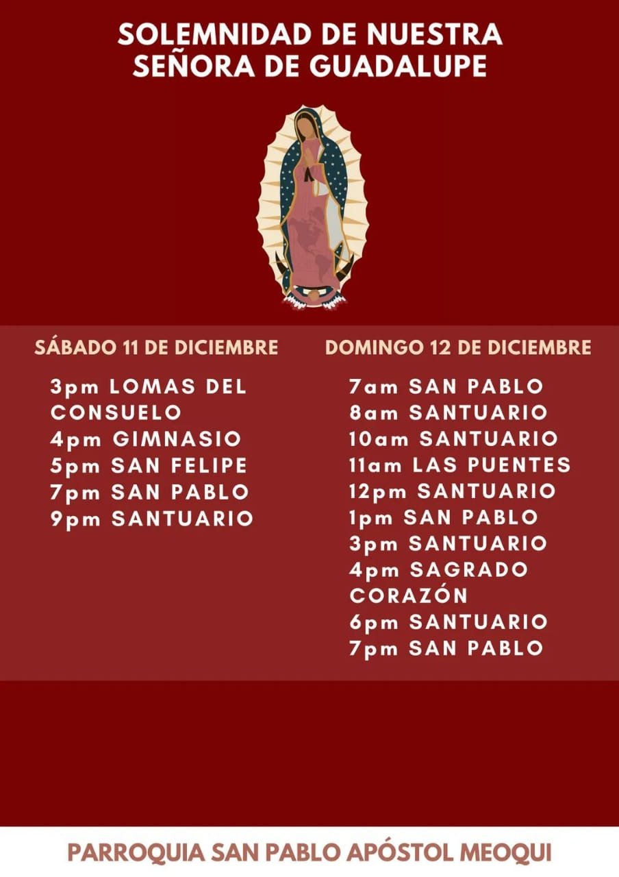 La Parroquia San Pablo Apóstol de Meoqui dio a conocer los horarios para las celebraciones a la Virgen de Guadalupe este fin de semana.