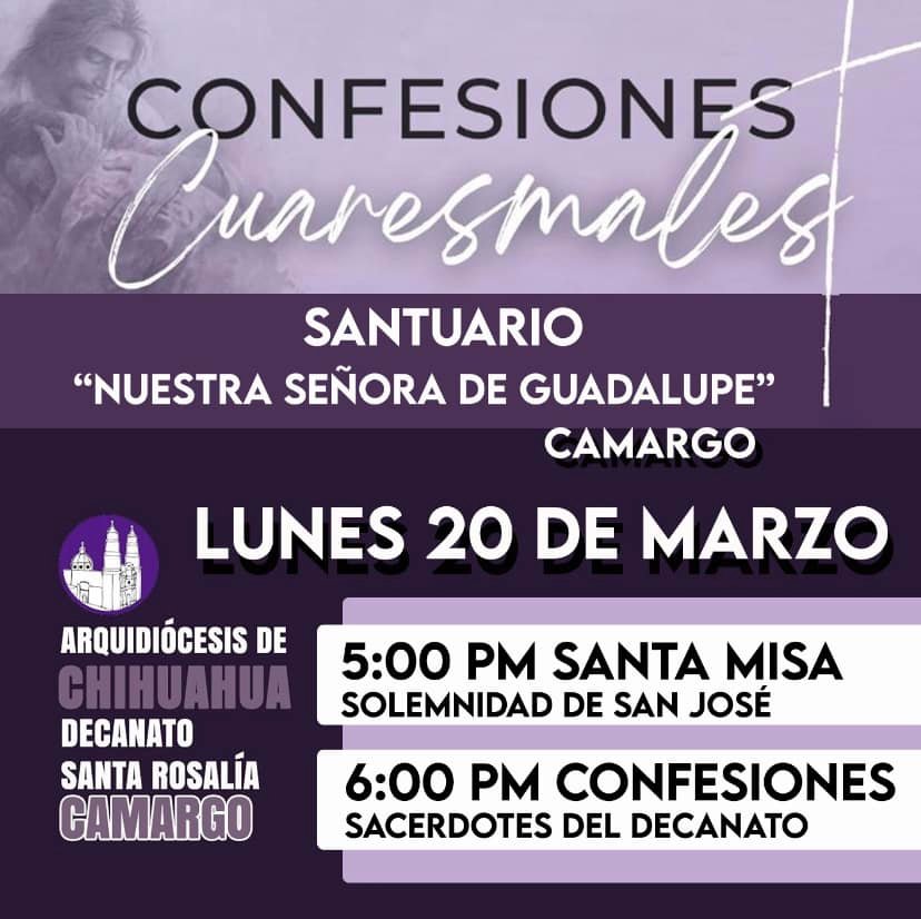 Esta semana del lunes 20 al viernes 24 de marzo, los 9 sacerdotes de las Parroquias que pertenecen al Decanato Santa Rosalía Camargo estarán haciéndose presentes un día por Parroquia para ofrecer el Sacramento de la Confesión.