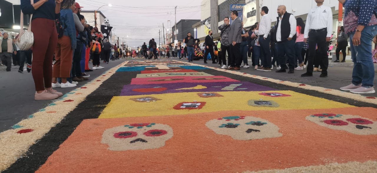 En este festival encontraron 10 mosaicos monumentales elaborados con aserrín de colores y veladoras. Estos tapetes tradicionales fueron hechos desde las 8 de la mañana por estudiantes, maestros y directivos de los 10 planteles de preparatoria y universidad de esta ciudad.