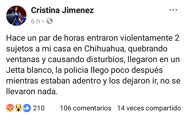 Chihuahua.- La aspirante a la dirigencia estatal del PAN y ex diputada federal, Cristina Jiménez, denunció a través de sus redes sociales una serie de disturbios al interior de su vivienda durante la madrugada de hoy.