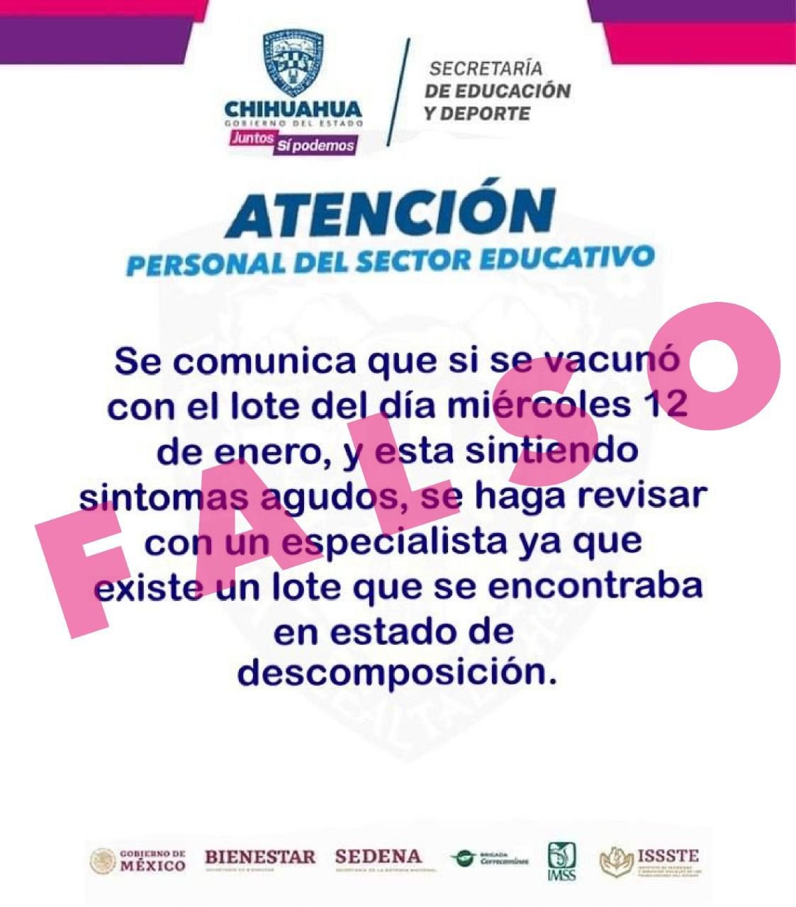 En el falso gráfico aparecen los logotipos de la Secretaría de Educación y Deporte del gobierno del estado; el del Gobierno de México, la Secretaría de Bienestar, SEDENA, Brigada Correcaminos, IMSS e ISSSTE.