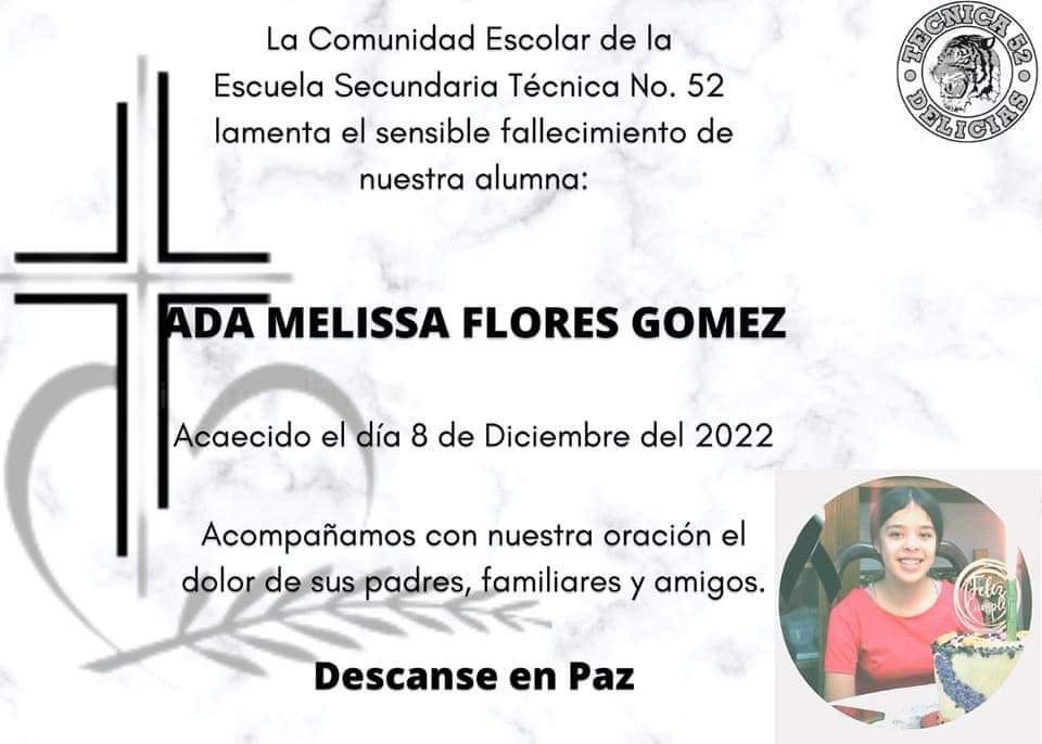 Dolor y consternación se vive en la escuela Secundaria Técnica 52 por el fallecimiento de la alumna Ada Melissa Flores Gómez.