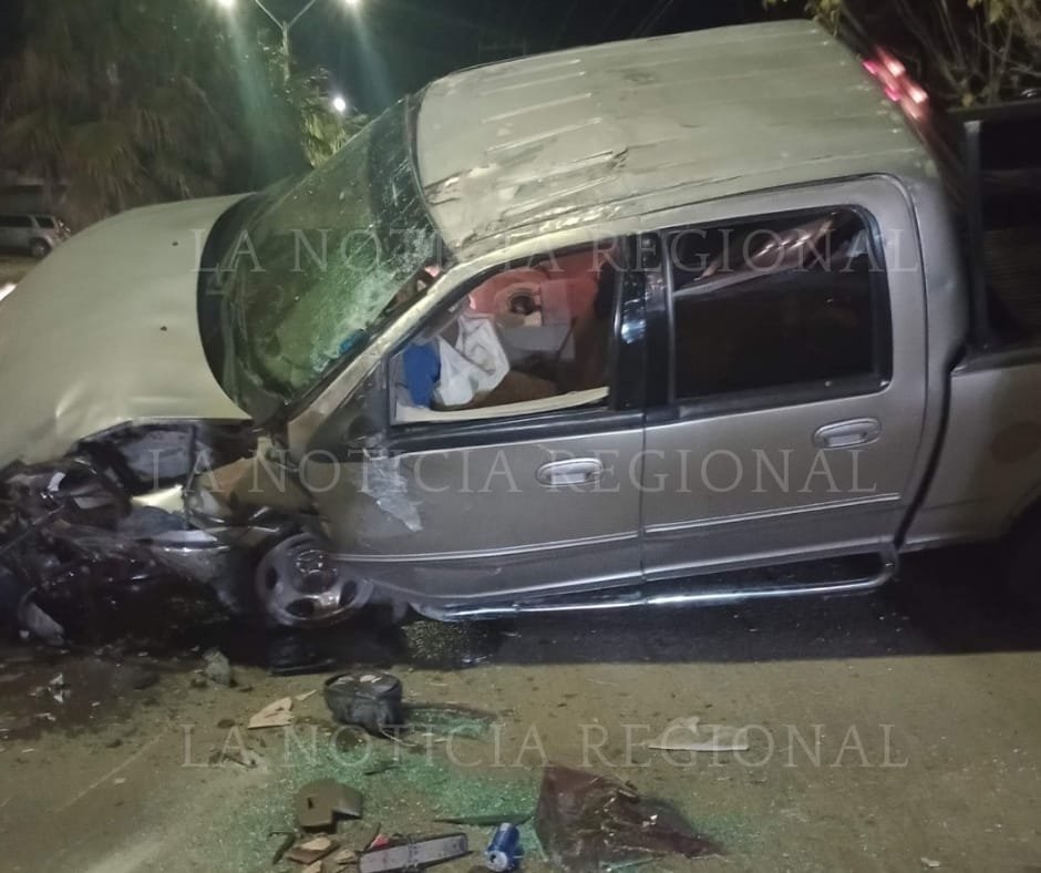 Se trata de una camioneta de una Ford, de color arena, doble cabina, la cual quedó destrozada de su parte frontal izquierdo, derribó una palmera y terminó arriba de un auto de color azul.