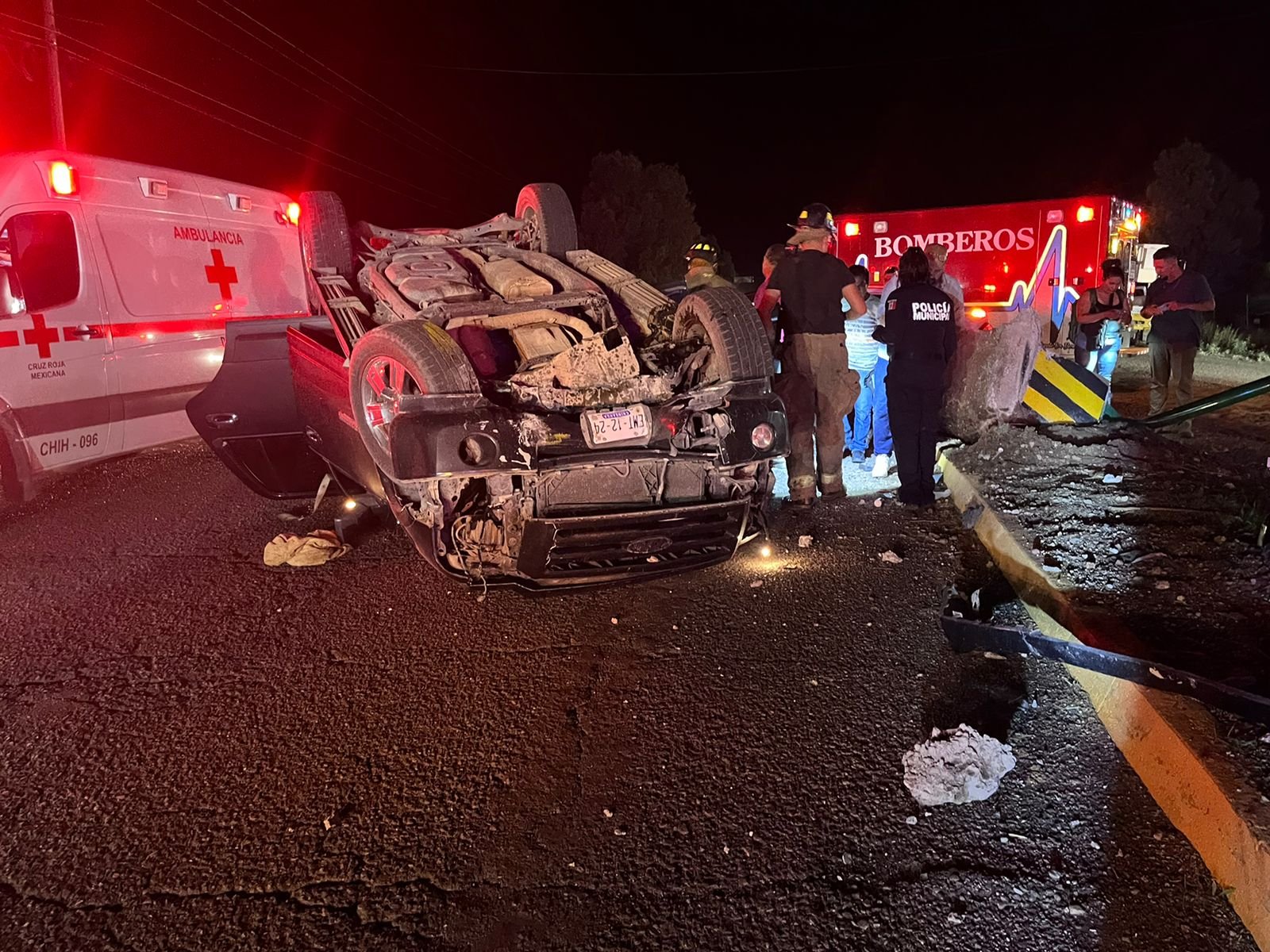 Ellos viajaban en una camioneta de la marca Ford, línea Expedition, color negro con matrículas del estado de Chihuahua, la cual quedó volcada después de impactar un señalamiento gráfico electrónico que sacó de tajo.