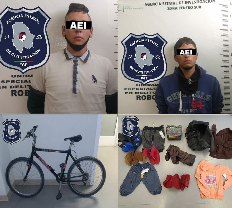 Los detenidos identificados como Esteban Heriberto R. L., y Adrián Moisés S. D., de 20 y 21 años respectivamente, traían consigo, varios objetos señalados como robados, un par de maletas, tres pares de botas, distinta ropa, una bicicleta rodada 26 y un acumulador.