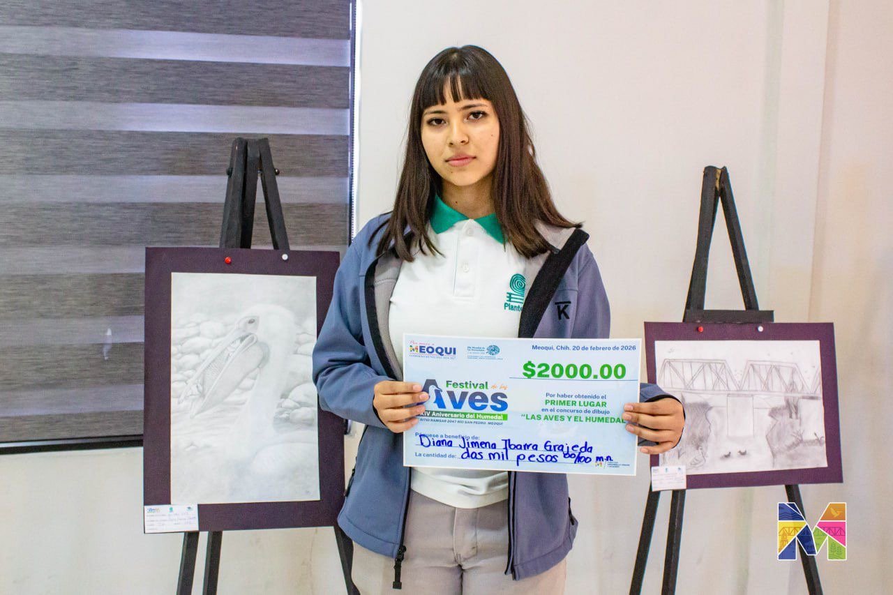 Con una obra cargada de profundidad y reflexión, Diana Jimena Ibarra Grajeda, estudiante del COBACH Plantel 26 de Lázaro Cárdenas, con su obra titulado “El tal vez”, haciendo referencia a las decisiones y posibilidades que surgen tras cada acción tomada, obtuvo el primer lugar y el premio de 2 mil pesos, en el concurso de dibujo “Las Aves y el Humedal”, celebrado por la dirección de Desarrollo Urbano y Ecología de Meoqui, en el marco del XIV Festival de las Aves.