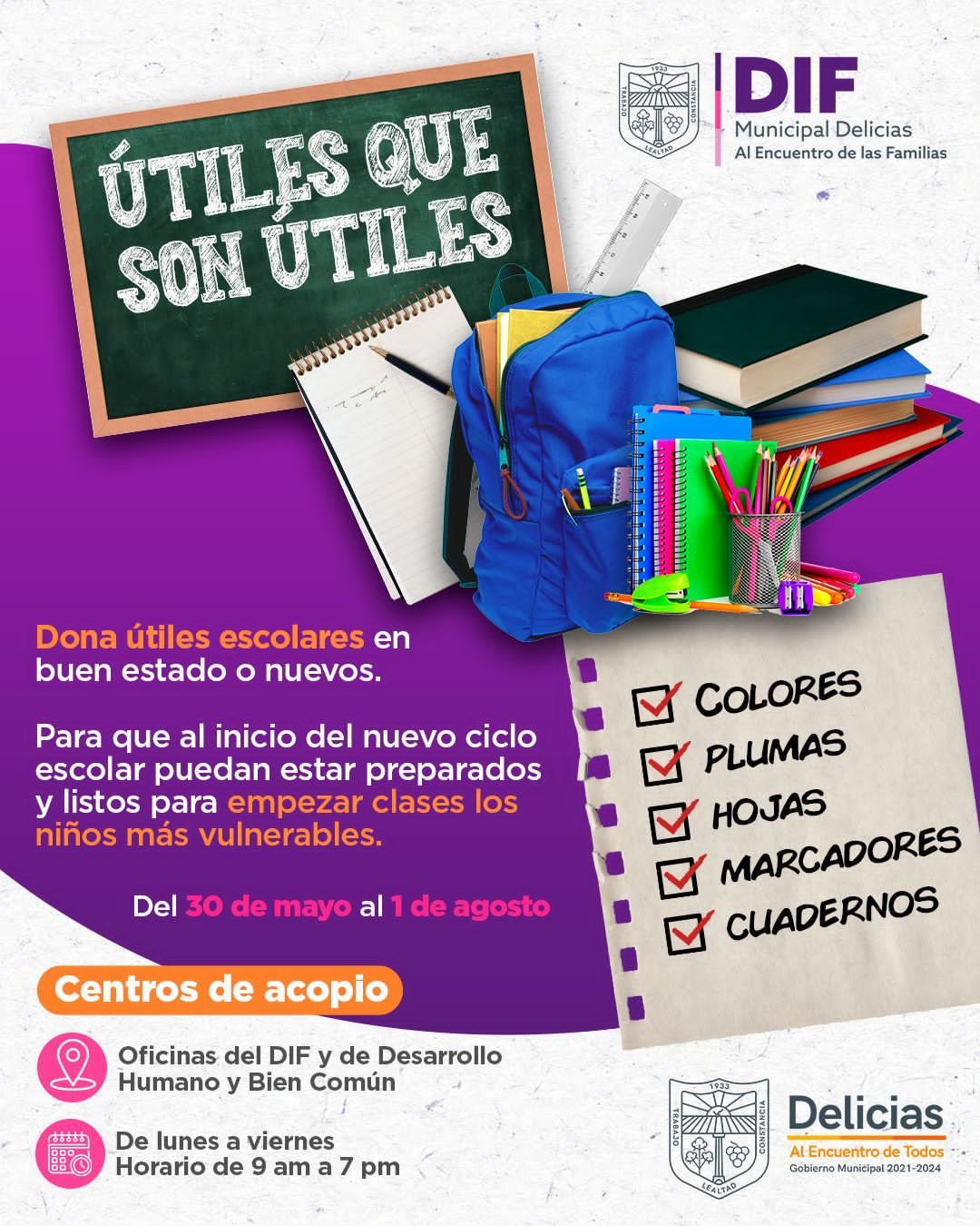 Con la finalidad de brindar apoyo a las familias en situación de vulnerabilidad, DIF Municipal Delicias, arranca campaña de colecta de útiles escolares nuevos o en buen estado, así lo menciono la Presidenta, la Maestra Alma Limas de Valenciano.
