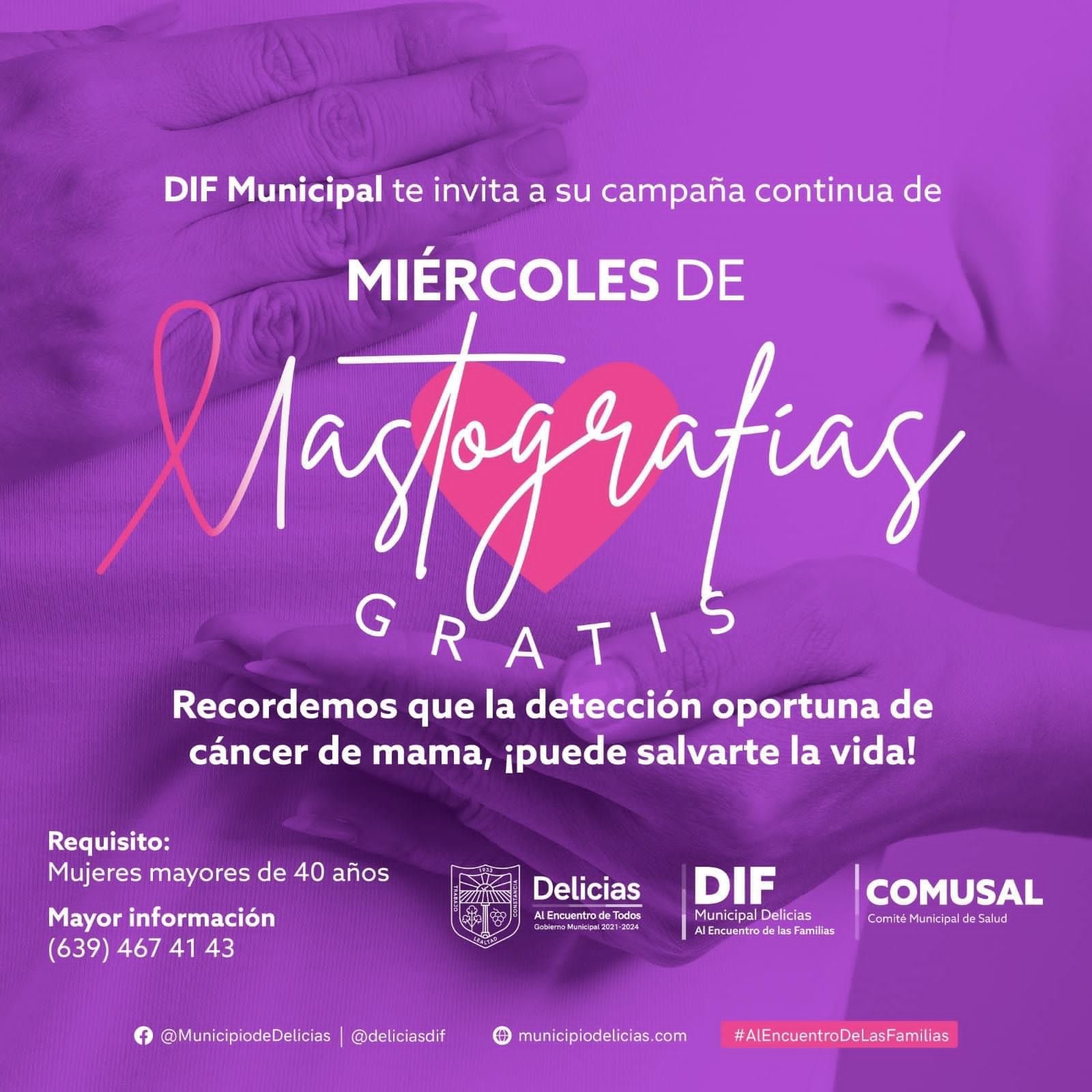 En atención al interés de la Presidenta del DIF Delicias, Alma Limas de Valenciano, de incentivar la cultura de la prevención contra el cáncer de mama, se ofrecen mastografías a mujeres mayores de 40 años, totalmente gratuitas.