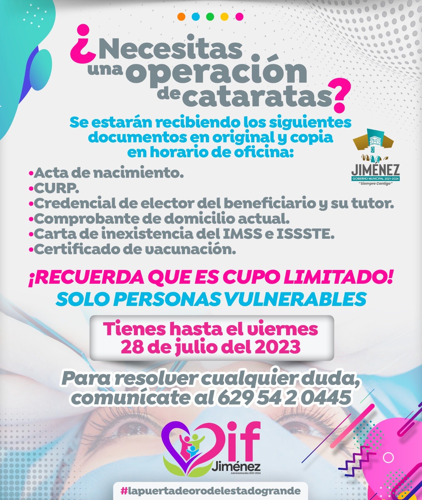 El DIF Municipal de Jiménez informó que se tendrá una campaña de operación de cataratas en el municipio.