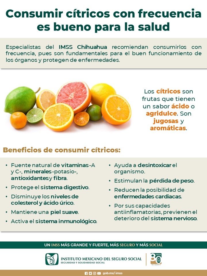 El Instituto Mexicano del Seguro Social (IMSS) en Chihuahua, a través de la Jefatura de Prestaciones Médicas, exhorta a la población a consumir cítricos en esta temporada, ya que previenen enfermedades respiratorias.