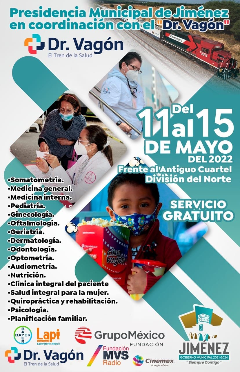 La presidencia municipal de Jiménez dio a conocer que el próximo 11 de mayo llegará al municipio el Doctor Vagón el cual ofrece servicios médicos gratuitos a la población más necesitada.