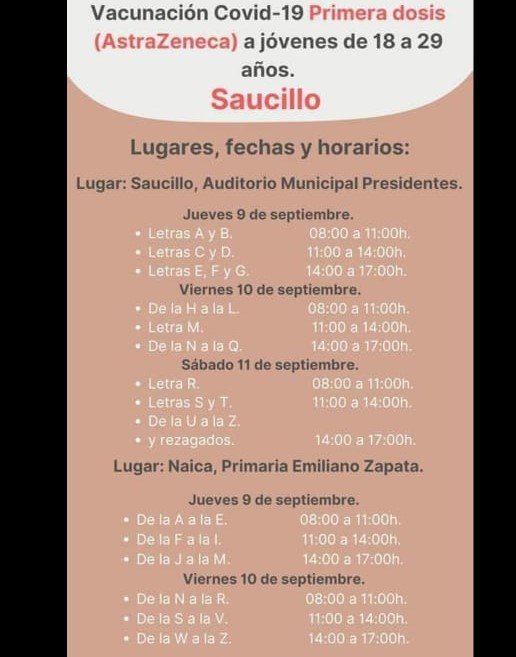 La primera dosis de la vacuna a aplicar a jóvenes de 18 a 29 años y mujeres embarazadas con más de 9 semanas de gestación mayores de 18 años se realizará del jueves al sábado en la cabecera municipal en el Auditorio Presidentes y en el seccional de Naica en la primaria Emiliano Zapata hasta el viernes.